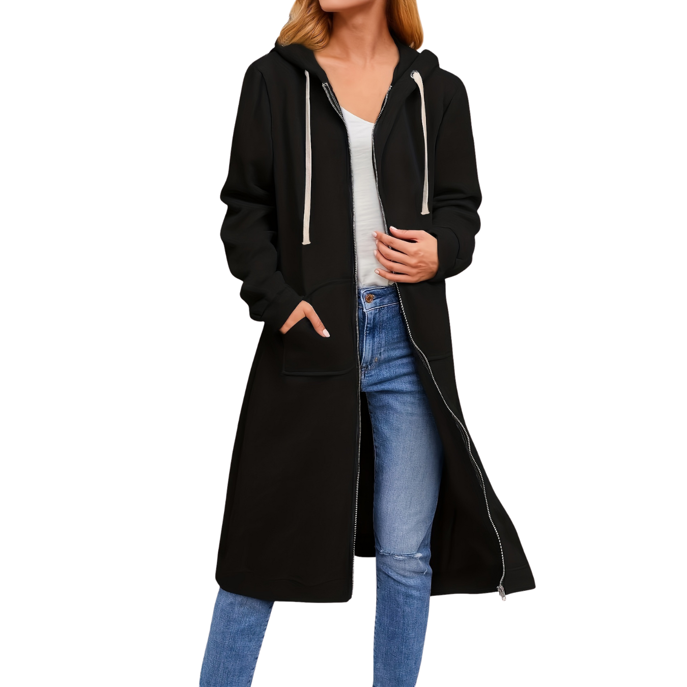 Dieser lockere, lange Strickmantel eignet sich für die kälteren Monate und ist eine praktische Option für den Lagenlook. Mit seinem Reißverschluss und seiner lockeren Passform lässt er sich leicht kombinieren. Das vielseitige Design passt sowohl zu lässigen als auch zu gepflegteren Looks und ist ideal für Herbst und Winter.